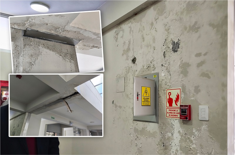Las fallas comienzan en los techos. Diversos pabellones presentan enormes y numerosas goteras que no solo afectan las estructuras de concreto, sino que se filtran hacia salones, laboratorios, talleres y pasadizos donde incluso se ubican tableros eléctricos. El riesgo es evidente. En varias azoteas se reportan filtraciones constantes y, como medida paliativa, la empresa instaló techos de calamina para intentar contener el goteo. Donde no se colocaron, el agua de lluvia se empoza en ambientes interiores. “Inclusive cuando ya no llueve sigue goteando porque en el techo se acumula el agua”, señalaron los directivos.