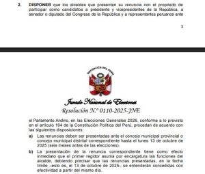 El documento del JNE indica que dichas renuncias tienen efecto inmediato y que los primeros regidores deben asumir la función de alcaldes encargados. “Las renuncias presentadas en la fecha límite del 13 de octubre de 2025 se entenderán como concedidas con efectividad a partir del mismo día”, señala la resolución.