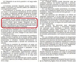 Dicha norma, en su artículo 6, numeral 6.5, apartado c), prohíbe expresamente a los funcionarios públicos “insertar en los bienes propios (indumentaria o accesorios) que porten durante el desarrollo de la función, cualquier símbolo, lema, imagen, pin, logo o similar que identifique o promueva, directa o indirectamente, intereses electorales”.