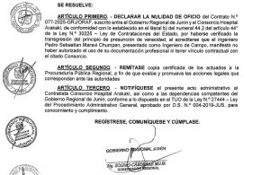 El Gobierno Regional de Junín (GRJ) declaró la nulidad de oficio del contrato suscrito para la construcción del Hospital Manuel Higa Arakaki de Satipo, luego de detectarse graves irregularidades en la conformación del equipo técnico presentado por el Consorcio Hospital Arakaki. Así lo establece la Resolución Ejecutiva Regional N° 285-2025-GRJ/GR, firmada por el gobernador Zósimo Cárdenas Muje el pasado 14 de octubre, mediante la cual se deja sin efecto el Contrato N° 077-2025-GRJ/ORAF suscrito el 6 de mayo de este año por un monto de 207’091,607.05 de soles.