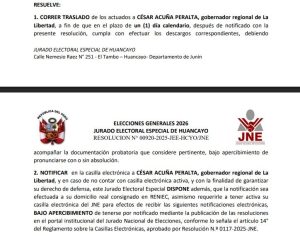 La medida fue formalizada mediante la Resolución N° 920-2025-JEE-HCYO/JNE, emitida el 23 de setiembre, con la que se notificó a Acuña para que responda a los cuestionamientos. El procedimiento se sustenta en el Informe de Fiscalización N° 189-2025-MCP-JEEHUANCAYO-EG2026/JNE, de fecha 21 de setiembre, en el que se concluye que el líder de APP habría vulnerado el principio de neutralidad electoral durante actividades proselitistas realizadas en Huancayo el 20 de setiembre.