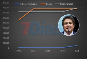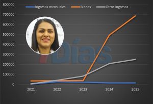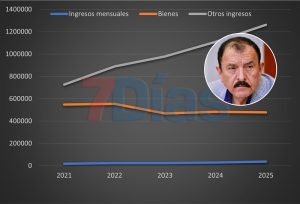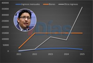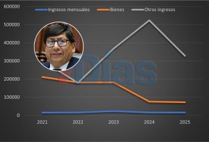 Su declaración de bienes y rentas del 2025 señala que ahora percibe obviamente su remuneración de congresista de 15,600, sus bienes ahora están valorizados en 150,000 soles y tiene otros ingresos anuales por 365,727 soles.