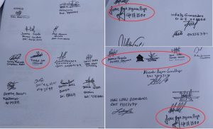 Otro de los puntos advertidos en dicho memorial, es que varios nombres se repiten en algunas hojas pero con diferente firma, además que las firmas y post firmas aparecen cortadas como si hubieran sido fotocopiadas de otras hojas, lo que pone en duda la veracidad de las mismas y que desbarata su contenido.