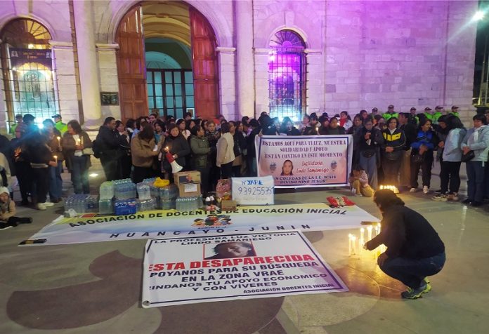Con velas encendidas y carteles en mano, integrantes de la Asociación de Docentes de Educación Inicial realizaron esta noche una emotiva vigilia en la Plaza de la Constitución de Huancayo para pedir la pronta aparición de la profesora Liz Victoria Lindo Samaniego, desaparecida hace ya seis días.
