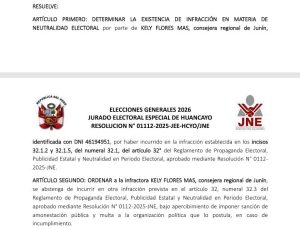 El Jurado Electoral Especial (JEE) de Huancayo determinó que la consejera regional de Junín, Kely Flores Mas, incurrió en infracción al principio de neutralidad electoral al participar en una movilización del partido Perú Libre, realizada el sábado 27 de setiembre.