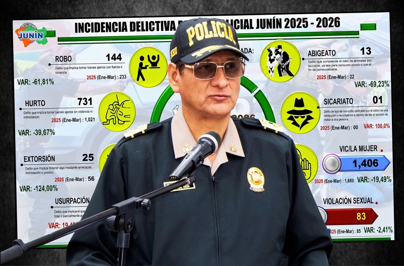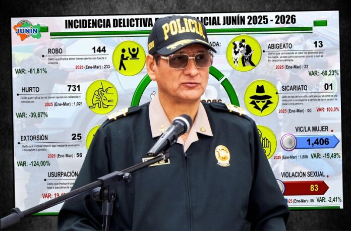 El jefe de la Región Policial Junín, general PNP César Calero Cisneros, presentó el balance de la incidencia delictiva correspondiente al primer trimestre del 2026 y reportó una reducción en los delitos de mayor impacto, como robos, hurtos y extorsiones, en comparación con el mismo periodo del 2025.