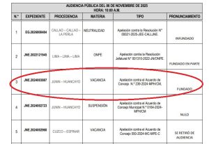 La decisión fue apelada por el propio regidor Misael Quispe Estrada, quien llevó el caso al JNE. La entidad resuelta declarar fundada la apelación tras la audiencia realizada el último jueves. Aunque la resolución íntegra aún no se publica, el organismo difundió su pronunciamiento con los resultados de la votación.