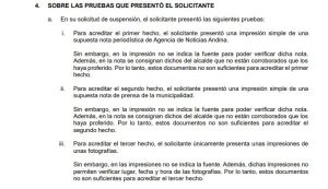 El documento también precisa que una nota de prensa emitida por la propia municipalidad no constituye un medio probatorio suficiente, pues -según el alcalde- las declaraciones no fueron corroboradas oficialmente. Además, señala que las fotografías presentadas por el solicitante, en las que aparece junto a los deportistas, carecen de fecha, hora y lugar, por lo que no pueden ser consideradas evidencia válida.