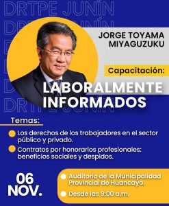 Con el propósito de fortalecer las capacidades laborales y promover el conocimiento de los derechos de los trabajadores, la Dirección Regional de Trabajo y Promoción del Empleo Junín (DRTPE Junín) organiza una importante jornada de capacitación a cargo del reconocido especialista en Derecho Laboral, Dr. Jorge Toyama Miyagusuku.