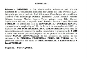 El Juzgado Constitucional Permanente de Huancayo emitió un severo ultimátum al Comité Electoral de la Universidad Nacional del Centro del Perú (UNCP) para que cumpla, en un plazo máximo de dos días, con la sentencia que ordena la exclusión de Elí Caro Meza como candidato a rector.
