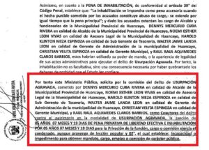 Tras concluir la etapa de investigación preparatoria, el fiscal Henry Gonzales Rivera también pidió la inhabilitación para ejercer función pública por el mismo periodo contra el alcalde Dennys Cuba Rivera, incluso si esta proviene de elección popular. El mismo requerimiento alcanza a Noemí León Vivas, exasesora legal; Harold Meza Espinoza, exsubgerente de Tesorería; Walter Landa León, exgerente de Administración; Raúl Claros Barrios, y el exgerente municipal Cristhian Velita en calidad de coautores del presunto delito contra el patrimonio en la modalidad de usurpación agravada.
