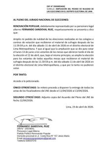 A través de una carta dirigida al Jurado Nacional de Elecciones (JNE), el personero legal alterno Fernando Sandoval Ruiz presentó una ampliación de su solicitud para anular los comicios en aquellos centros de votación que recibieron el material electoral después de las 11:59 p.m. del sábado 11 de abril.