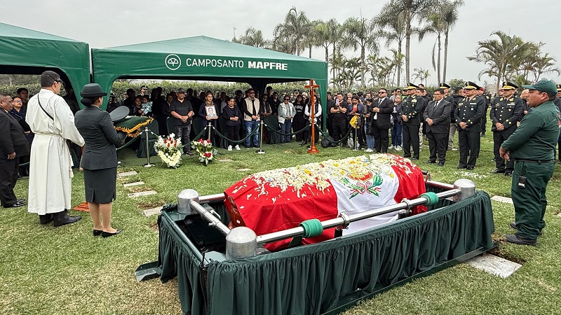 Los restos del policía José Gabriel Munive Gurmendi, abatido en La Victoria-Lima durante un tiroteo con delincuentes extranjeros, fueron sepultados en el cementerio Santa Rosa de Chorrillos.